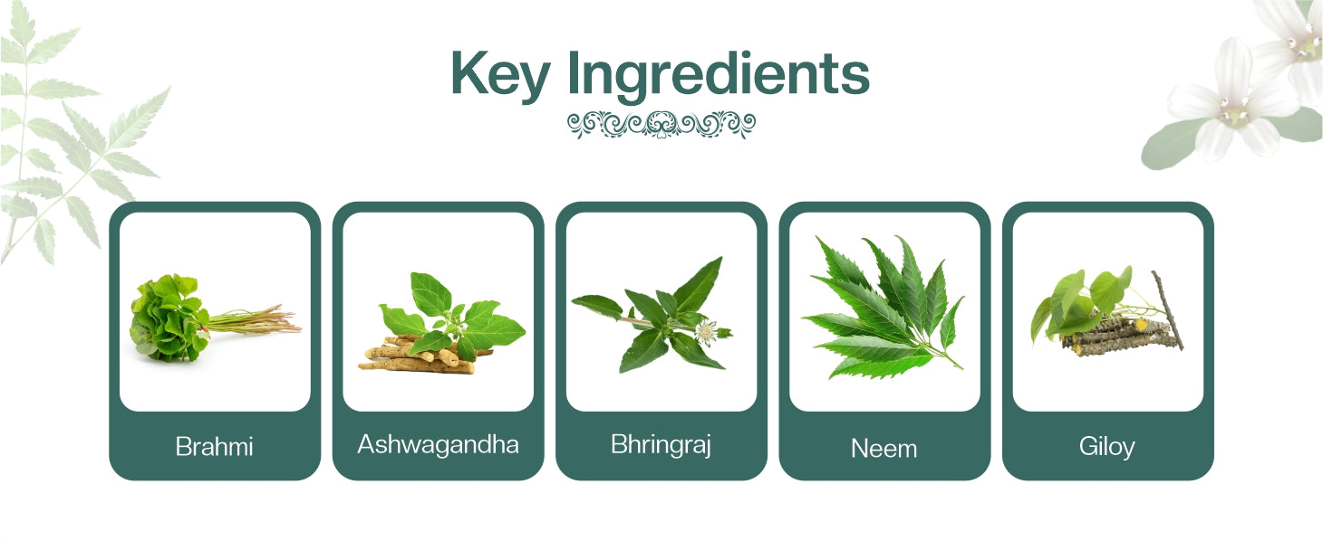 PROVIDE NATURAL HAIR GROWTH: This tablet is packed with Ashwagandha, Brahmi, Bhringraj, Neem, and Giloy, supports natural hair growth by nourishing roots and improving scalp health.