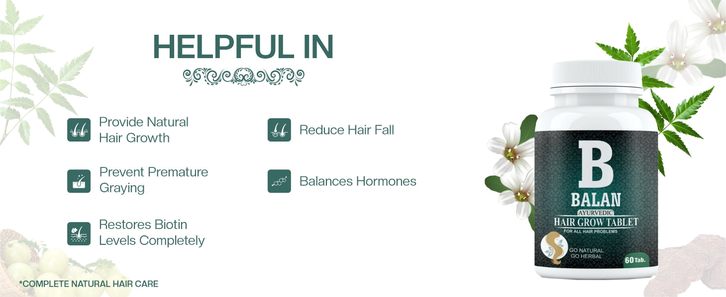 BALAN HAIR GROW TABLET INGREDIENTS: Balan Ayurvedic Hair Grow Tablets include powerful herbs such as Amla, Bhringraj, and Ashwagandha. These herbs improve hair growth, reduce hair fall and strengthen hair follicles inside the scalp.